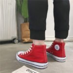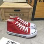 This classic red high-top canvas shoe features a simple and elegant design, making it a versatile choice for everyday wear. The upper is made of high-quality canvas material, offering breathability and durability for all-day comfort. The non-slip rubber sole enhances grip, ensuring walking safety. The timeless red-and-white color combination is stylish yet understated, suitable for various occasions, including campus life, casual outings, or daily commuting. The reinforced toe design improves durability, while the white laces add a touch of brightness to the overall look. This unisex shoe is an ideal choice for those seeking both comfort and style.