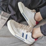 - Classic Color Combination: White base with blue stripes and a red heel for a simple yet fashionable design.