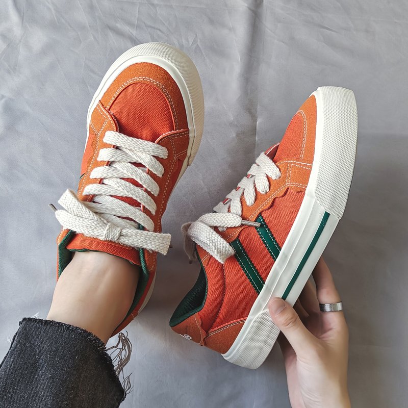 These retro-style casual shoes feature a vibrant orange base accented with classic green stripes, showcasing a unique blend of fashion and streetwear appeal. Crafted from premium canvas material, they are breathable, durable, and comfortable for all-day wear. The sturdy, anti-slip rubber sole ensures excellent grip and wear resistance, while the soft insole and lightweight design provide lasting comfort. Perfect for daily outings, campus life, or street fashion, these sneakers effortlessly complement any outfit, making them a must-have addition to your wardrobe.