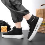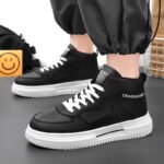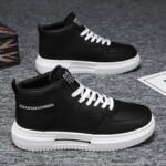 These black and white high-top sneakers combine fashion and functionality, making them the perfect fit for everyday wear and trendy street style. The upper is crafted from high-quality synthetic leather, presenting a sleek and premium texture. Paired with a durable white thick sole, these shoes provide excellent grip and support for all-day comfort. The classic lace-up design ensures a secure fit, while the unique brand print on the side adds a touch of style. Whether for casual outings, campus commutes, or trendy streetwear looks, these high-top sneakers are your ideal choice!