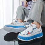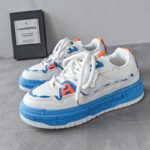 These stylish casual sneakers feature a unique blue and white color combination with eye-catching orange accents, exuding a youthful and trendy vibe. The upper is crafted from premium breathable mesh and durable materials, ensuring long-lasting comfort and ventilation for extended wear. The thick elevated blue outsole not only enhances the fashion appeal but also delivers superior cushioning for stable and comfortable steps. The simple lace-up design makes them easy to put on and take off, effortlessly complementing streetwear, casual, or sporty styles.