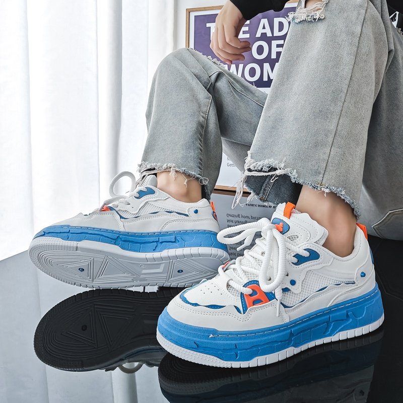 These stylish casual sneakers feature a unique blue and white color combination with eye-catching orange accents, exuding a youthful and trendy vibe. The upper is crafted from premium breathable mesh and durable materials, ensuring long-lasting comfort and ventilation for extended wear. The thick elevated blue outsole not only enhances the fashion appeal but also delivers superior cushioning for stable and comfortable steps. The simple lace-up design makes them easy to put on and take off, effortlessly complementing streetwear, casual, or sporty styles.