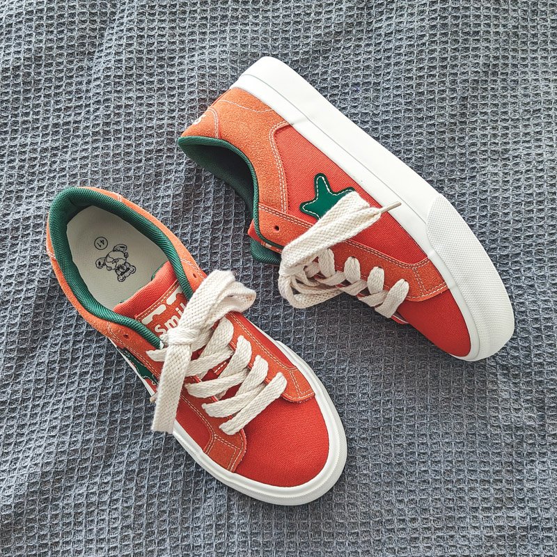 These low-top canvas shoes feature a bold orange upper paired with an eye-catching green star accent, showcasing a unique personality and youthful style. The clean silhouette combined with premium canvas material ensures a breathable and comfortable fit, perfect for daily outings or casual wear.